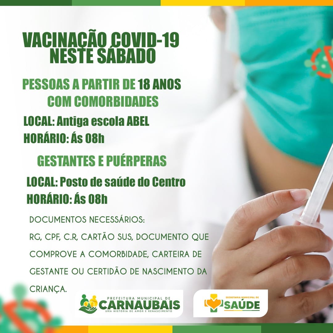 No que diz respeito às gestantes e puérperas, a etapa de vacinação também continua no sábado, no posto de saúde do Centro. Será necessário levar documentos de identificação, cartão do sus, a carteira de gestante ou certidão de nascimento da criança. Em caso de comodidade, levar documento de comprovação.