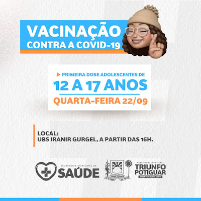 A Prefeitura de Triunfo Potiguar, por meio da Secretaria Municipal de Saúde informa a toda população que nesta quinta-feira será aplicada a primeira dose do imunizante contra o coronavírus para adolescentes de 12 a 17 anos.