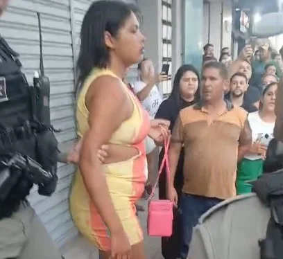 Ao ser colocada na carroceria da viatura policial, a mulher falou que estava gravida e passou a usar linguagem grosseira a população que estava no local.